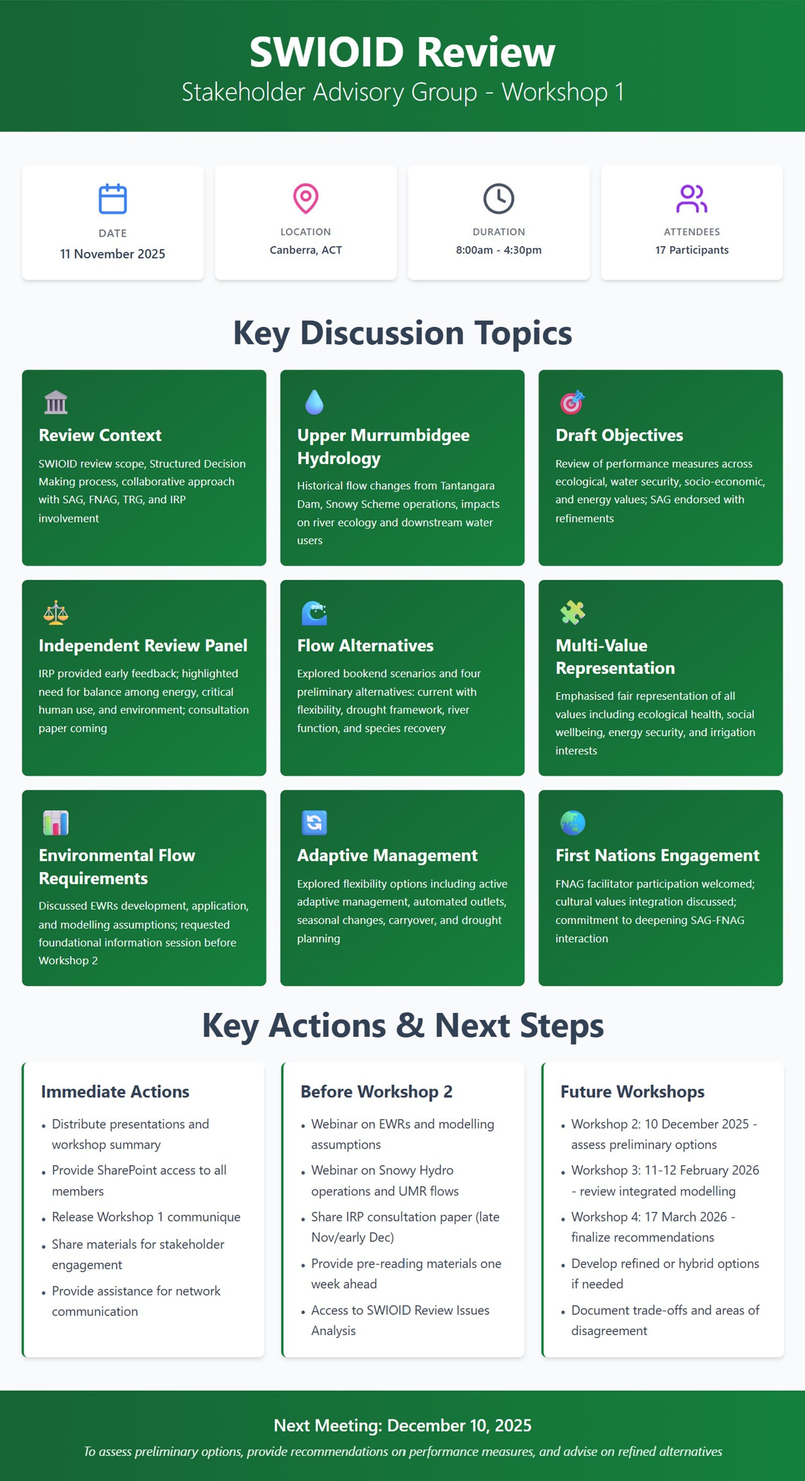 The first Stakeholder Advisory Group (SAG) workshop for the SWIOID Review was held in Canberra on 11 November 2025, with 17 members attending from community groups, local government, conservation organisations, irrigators and other water users, First Nations representatives and Snowy Hydro Limited.